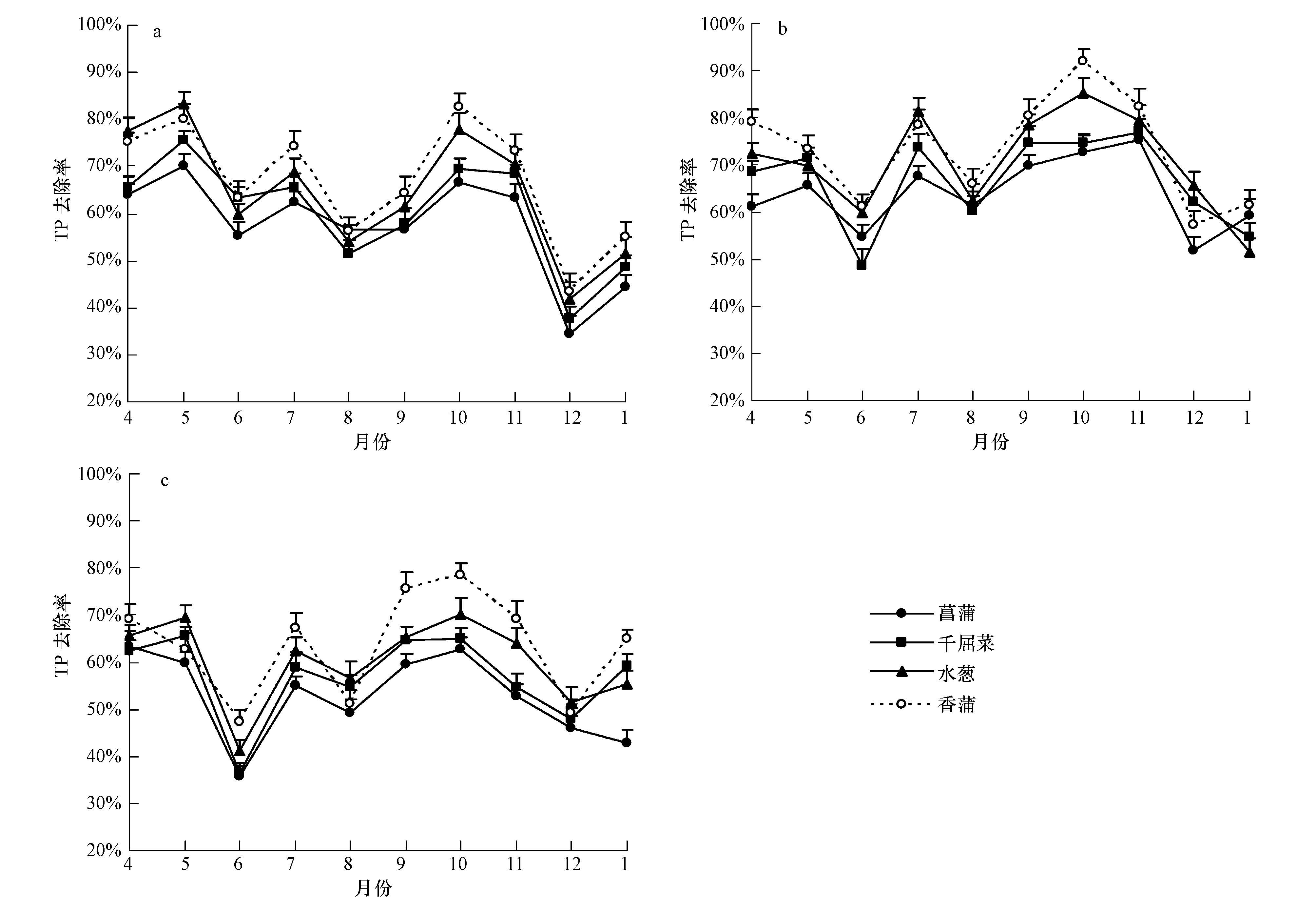 對于TP去除率,其在所有進水負荷條件下都表現出在香蒲和水蔥濕地稍高于菖蒲和千屈菜濕地(圖 4).表 3分析發現,季節對TP去除率的影響明顯(p<0.05).較高的TP去除率出現在4—5月,但最低值大都出現在冬季(12月,C/N=10 ∶ 1情況下最低值出現在6月)(圖 4).TP去除率在菖蒲濕地總是相對較低,且受季節變化影響顯著.