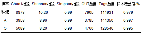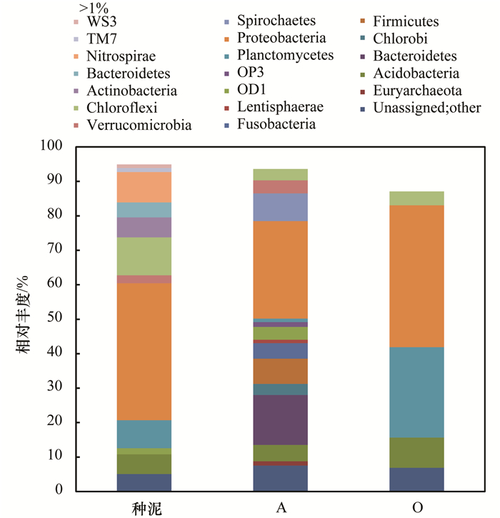 為了研究本體系內微生物的種群結構特征, 本實驗選取3個污泥樣品, 分別為接種期種泥、運行期A段反應器污泥和O段反應器污泥, 對這些微生物樣品進行聚類與多樣性分析, 其OTU數目、有效序列條數統計及微生物α多樣性相關的各項指標見表 3和圖 7所示.根據指標結果, 本研究中樣品曲線基本趨于平緩, 各測序結果占整個基因組的97%以上, 覆蓋度高, 證明樣品測序量能夠準確反映出樣品的物種豐度.