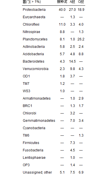 本實驗運行期的A段反應器污泥和O段反應器污泥, 采用宏基因組16S rDNA宏基因測序分析技術, 對反應體系內微生物的菌群結構特征進行研究, 其結果如圖 8和表 4所示.