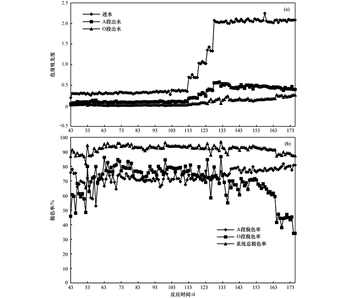 雙氧水在水中會分解產生羥基自由基, 可有效降解含共軛雙鍵的發色基團及其他含有復雜芳香環的官能團, 因此當其與水解酸化、接觸氧化共同作用時, 會對印染廢水有顯著的脫色性能.從圖 6結果可知, 在運行43~113 d期間, 當廢水進水染料濃度為10 mg·L-1時, 其水質在波長600 nm處的吸光度為0.26~0.38, 經雙氧水協同水解酸化A段和接觸氧化O段處理后, A段的色度去除能力先處于波動狀態, 后穩定持續在70.0%左右, 而O段的色度去除能力先持續增強, 后穩定維持在80.0%左右小范圍波動; 從114~176 d, 隨著染料投加從20 mg·L-1增加到60 mg·L-1時, A段的色度去除能力呈緩慢增強趨勢, 體現出雙氧水與水解酸化協同強化作用; 而O段的色度去除能力呈顯著下降趨勢, 總體系的色度去除能力有略微下降趨勢, 但整體上呈現較為穩定的狀態.在整個這一運行過程中, 反應體系的最大脫色率為96.3%, 平均脫色率為92.1%.這一結果體現出雙氧水協同水解酸化-接觸氧化方法對色度去除的技術優勢.