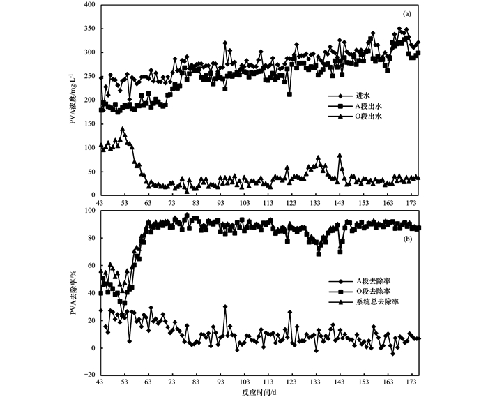 從圖 5結果可知, 在43~53 d期間, 該反應體系經歷了短期的適應階段后, 于第54 d開始, 隨著進水PVA濃度的增大, 水解酸化A段對其去除能力呈緩慢下降趨勢, 而接觸氧化O段對PVA的去除能力不斷增強, 到63 d時該段對PVA的去除率達到90.8%.此后隨著運行時間的增長, 接觸氧化O段對PVA依然保持良好的去除能力, 即PVA最大去除率達到94.4%, 平均去除率為87.4%.這一結果再次證明, 雙氧水對水解酸化-接觸氧化的生化處理能力的提升與強化作用.