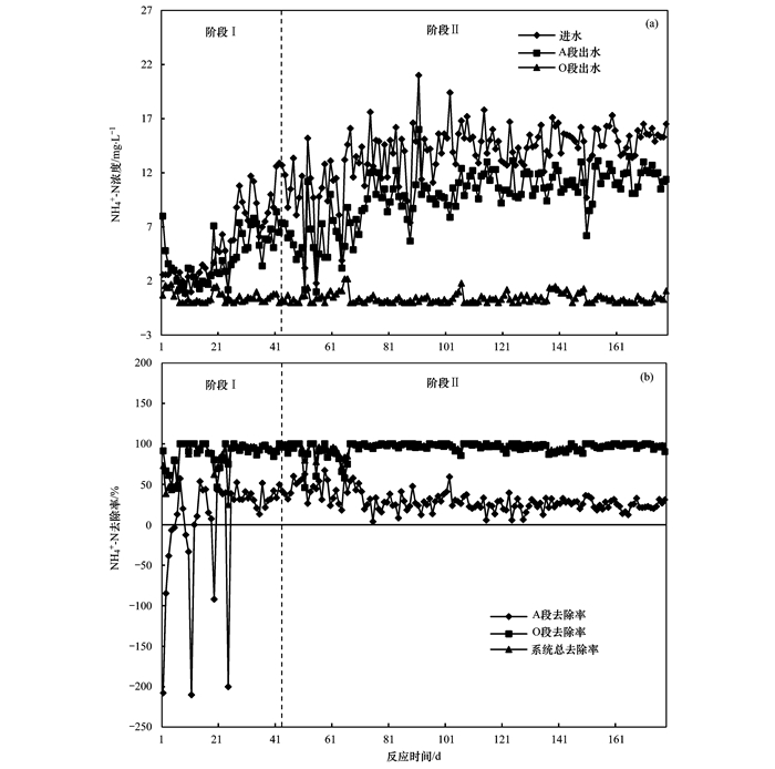 (1) 第一階段 配置模擬生化廢水進水COD濃度為450.0~500.0 mg·L-1的模擬廢水, 其主要成分為可溶性淀粉, 葡萄糖, 碳酸銨, 磷酸二氫鉀, 使得BOD5:N:P為100:5:1, 開始連續進水, A段和O段的HRT均為12 h, O段DO為2.5~3.5 mg·L-1. 20 d后, 當O段出水COD穩定小于30.0 mg·L-1、氨氮為0.0 mg·L-1時, 第一階段完成(該階段僅為啟動環節, 出水水質數據不作為本實驗的分析內容).