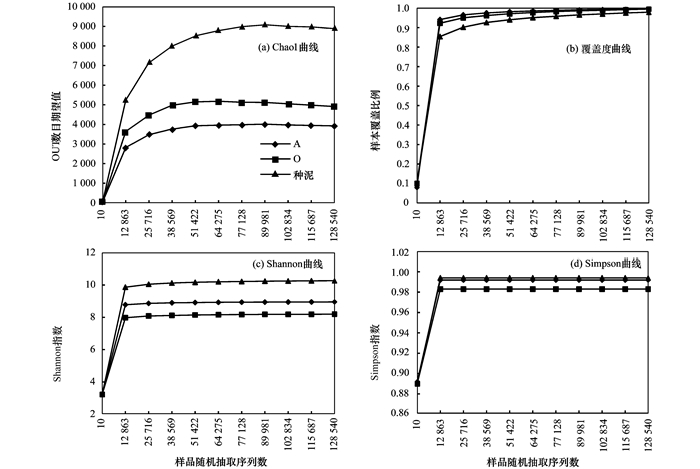 樣本覆蓋度:是指測序結果占整個基因組的比例.通常將該指標與聚類、α多樣性指標的稀釋曲線相結合, 用于評價測序量是否覆蓋所有類群, 并間接反映樣品中物種的豐富程度.當曲線趨于平緩或者達到平臺期時則認為測序深度已基本覆蓋樣品中的所有物種.
