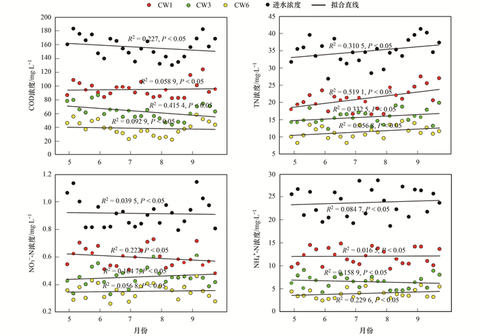 圖 2 3個人工濕地中COD、TN、NO3--N及NH4+-N進出水濃度分析