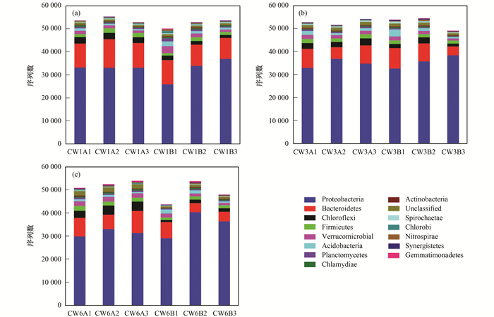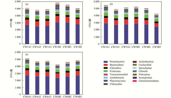 高通量測序方法分析的18個樣品中共得到945 864條高質量序列和20 823個OTUs(按97%的相似度劃分), 涵蓋15門、50綱、115目、230科及910屬. 圖 3為微生物在門類水平上的OTUs分布.從中看出, 3個人工濕地中, 變形菌門(Proteobacteria)和擬桿菌門(Bacteroidetes)的豐度相對較高; 其次分別為綠彎菌門(Chloroflexi)、疣微菌門(Verrucomicrobial)、厚壁菌門(Firmicutes)、酸桿菌門(Acidobacteria)、浮霉菌門(Planctomycetes)和衣原體菌門(Chlamydiae), 它們分別占CW1總數的1%~10%之間; 綠菌門(Chlorobi)、硝化螺旋菌門(Nitrospirae)、螺旋體菌門(Spirochaetae)、放線菌門(Actinobacteria)、Synergistetes以及芽單胞菌門(Gemmatimonadetes)豐度極低( < 1%).比較而言, CW6和CW3的OTUs數量略低于CW1, 考慮原因主要是由于在現有污染物濃度下, 多層結構濕地系統對污染物有較好的凈化效果, 使得污染物濃度沿水流方向呈現出從高到低的梯度代謝規律, 床體各處污染物種類相對簡單, 從而有利于不同功能微生物的分區富集, 使其種類趨于集中.有研究表明, 在水平潛流人工濕地中, 微生物群落數量隨深度和排污口距離的增加而減少.因而, 從床體中OUTs的分布上來看, 一般而言, 進水中較高的營養物質濃度及床體表層中豐富的溶解氧容易造成OTUs在數量上進水端高于出水端, 床體表層高于底層的趨勢, 如圖 3(b)、3(c)所示, 這與Button等的研究結果相似.但對比分析發現CW1在分布上[圖 3(a)], 出水端OTUs數量高于進水, 表明該系統對污染物凈化性能有限, 較多的污染物到達出水端, 造成出水端的OTUs數量較高.