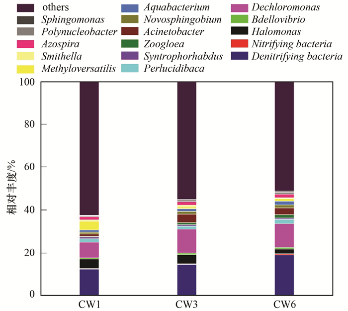 人工濕地中含氮污染物的去除機理主要有硝化作用、反硝化作用以及氨氧化作用等.與之相關的微生物主要有氨氧化真菌/細菌、硝化細菌(Nitrifying bacteria)和反硝化細菌(Denitrifying bacteria).通過分析發現, 變形菌門(Proteobacteria)中包含硝化菌屬和絕大多數的反硝化菌屬, 硝化菌屬有Nitrosococcus和Nitrosomonas, 硝化菌屬序列數在3個系統(CW1、CW3和CW6) 中所占比例分別為0.25%、0.26%和0.51%(圖 6); 而反硝化菌屬主要包括Denitratisoma、Pseudomonas、Thauera、Comamonas、Azoarcus、Acidovorax、Rhizobium、Rhodobacter、Hydrogenophaga、Arcobacter、Thiobacillus、Sulfurimonas和Paracoccus, 3個系統中反硝化菌屬序列數所占比例分別為12.5%、14.7%及19.1%(圖 6), 它們對3個系統中含氮污染物的降解起決定性作用.如圖 6所示, CW6中硝化細菌的豐度比例遠遠高于CW1和CW3, 這可能是CW6中氨氮去除率(83%)高于CW1(49%)和CW3(72%)的主要原因.此外, 3個系統中反硝化菌屬豐度均高于硝化菌屬說明硝化作用可能是制約該系統除氮效率的關鍵因素, 這可能是由于水平潛流人工濕地中的缺氧或厭氧環境更適合反硝化細菌生存所致, 此結果與Vymazal的研究結果一致.