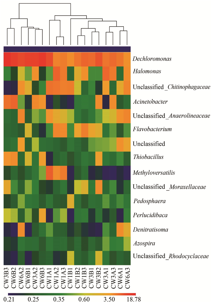 應用Bray-Curtis距離算法和Complete聚類法, 將3個系統中屬水平上主要菌群中的高豐度和低豐度的物種分塊聚集, 通過顏色梯度及相似程度來反映多個樣本在各分類水平上群落組成的相似性和差異性.如圖 8所示, 藍色相似度最差, 紅色相似度最高.結果表明, 最高相似度為18.78%, 整體相似度較低. Denitratisoma、Azospira、Pedosphaera和Thiobacillus均是反硝化菌屬, 其中Denitratisoma、Azospira、Pedosphaera屬于異養型, Thiobacillus是自養型, 它們的生存代謝依賴有機物濃度和硝酸鹽濃度.從圖 8中可以看出, 就整體而言, CW3和CW6中Denitratisoma、Azospira和Thiobacillus等反硝化菌屬的豐度高于CW1, 這有助于提高CW3和CW6系統中硝態氮的去除.而對于單個系統, 3種菌屬的豐度差異分別體現在CW3和CW6的進水端采樣點(A)和出水端采樣點(B), 其原因可能是由于進水中含有豐富的有機物和硝態氮使得異養反硝化菌屬(Denitratisoma和Azospira)富集在CW3和CW6進水端, 相比之下, 由于CW3和CW6對有機物的高效降解使得其出水端以自養型反硝化菌屬(Thiobacillus)為主.此外, CW1的6個采樣點基本處于同一個豐度水平, 其結果與主成分分析結果一致.