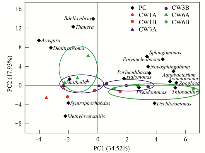 鑒于3個系統中變形菌門(Proteobacteria)的含量較高, 存在差異, 并且它與污染物的去除密切相關, 因而對其主要菌屬群進行主成分分析.如圖 7所示, 為3個人工濕地中變形菌門(Proteobacteria)的屬水平PCA分析. PC1和PC2分別占變異總數的34.52%和17.93%, 占PC1比重大的前3種主成分分別為Zoogloea(90.5%, 正相關)、Thiobacillus(89.2%, 正相關)以及Aquabacterium(86.9%, 正相關), PC2的前3種菌屬分別為Bdellovibrio(87.6%, 正相關)、Thauera(77.3%, 正相關)以及Azospira(59.4%, 正相關).其結果顯示, 3個系統在變形菌門(Proteobacteria)屬水平上的微生物群落分布無顯著差異, 而就各濕地進出水端而言, CW3的進水端(A)和出水端(B)及CW6的進水端(A)和出水端(B)的群落結構分別在PC1水平上均呈現顯著差異.樣點A受Azospira以及Denitratisoma影響較大, 而樣點B則更多地被Zoogloea及Thiobacillus影響. Zoogloea是一種有機物代謝菌屬, Thiobacillus則是參與硫代謝的自養型反硝化菌屬, 而Azospira和Denitratisoma則是2種與氮代謝相關的異養反硝化菌屬, 它們的存在依賴于有機物和硝酸鹽的濃度大小. CW3和CW6中進出水端較為明顯的微生物群落代謝差異顯示出含氮污染物(如NO3--N及NH4+-N)和有機物在該系統不同床體區域存在一定降解梯度, 從而導致微生物功能的分區富集.比較而言, CW1的樣品點主要集中在原點附近, 各樣點間的微生物群落結構無顯著性差異, 因而出現3個系統間的凈化差異.這與多層結構對含氮污染物的凈化效率高于單層結果一致.