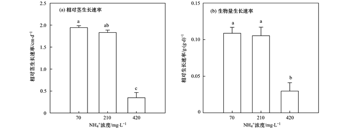 70 mg·L-1的高NH4+處理下, 綠狐尾藻生長健壯(圖 1), 莖高和生物量隨著時(shí)間的延長在直線增加[圖 2(a)和(b)], 至21 d時(shí), 綠狐尾藻的相對莖高和生物量分別達(dá)到40.56 cm和17.82 g·穴-1, 其莖和生物量的生長速率分別是1.94 cm·d-1和0.11 g·(g·d)-1(圖 3).與70 mg·L-1的NH4+處理相比, 當(dāng)NH4+水平增加到210 mg·L-1時(shí), 相對莖高和生物量略有降低, 它們的生長速率與其無顯著差異(圖 3); 而當(dāng)NH4+水平達(dá)到420 mg·L-1時(shí), 莖高和生物量生長速率均顯著降低, 僅為對照的27.4%和17.9%, 且10 d時(shí)即達(dá)到最高值, 之后則表現(xiàn)出生長不良甚至死亡的現(xiàn)象[圖 1、圖 2(a)和(b)].