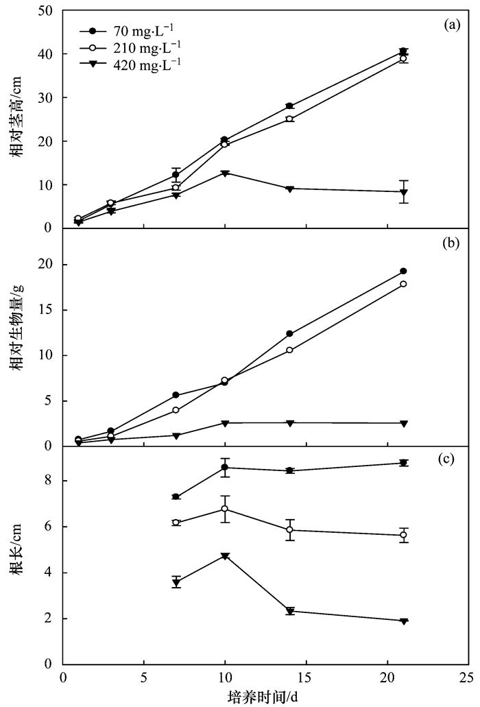 培養(yǎng)1、3、7、10、14、21 d, 稱取鮮重和測量地上部高度, 以及植物的TN和TP; 于7、10、14、21 d測量根長.收獲(21 d)時(shí), 測定葉、莖葉綠素和可溶性糖含量, 以及組織的丙二醛(MAD)含量.