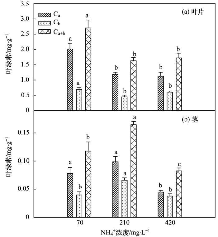 莖的總?cè)~綠素顯著低于葉片, 僅為葉片的4%~10%. 70 mg·L-1 NH4+處理下, 莖葉綠素的含量為0.12 mg·g-1, 當(dāng)NH4+水平提高到210 mg·L-1時(shí), 莖的總?cè)~綠素含量顯著增加, 增加了40%;而當(dāng)NH4+水平增加到420 mg·L-1時(shí), 莖的總?cè)~綠素含量顯著降低, 降低了30%[圖 4(b)].相應(yīng)地, 與70 mg·L-1 NH4+處理相比, 210 mg·L-1 NH4+處理下, 葉綠素a及葉綠素b顯著提高, 分別提高了26.5%和66%;而達(dá)到420 mg·L-1 NH4+處理時(shí), 葉綠素a與b顯著降低, 分別降低了42.4%和5.1%[圖 4(b)].莖中葉綠素a與葉綠素b的比值亦隨著NH4+水平的提高而降低, 70、210和420 mg·L-1處理下, 其比值分別是2.0、1.5和1.2.