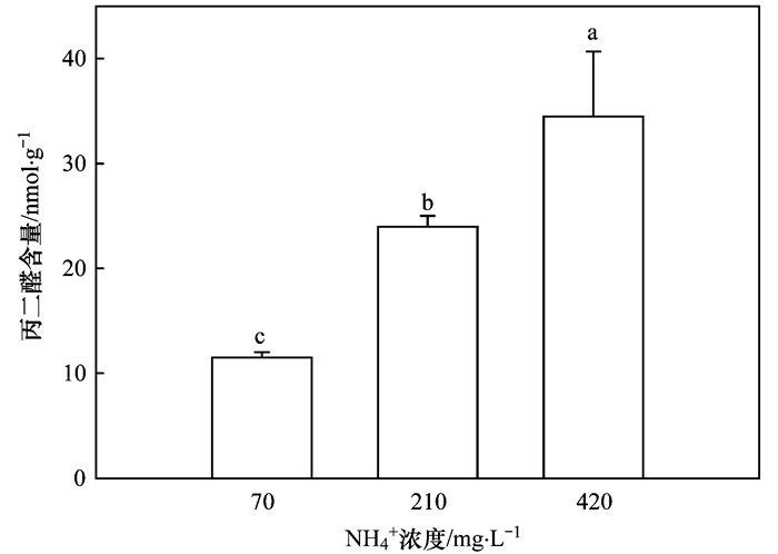 隨著NH4+水平的增加, 丙二醛含量逐漸增加(圖 6). 70 mg·L-1的NH4+處理下, 丙二醛的質(zhì)量摩爾濃度最低為11.5 nmol·g-1.當(dāng)NH4+水平增加到210 mg·L-1和420 mg·L-1時(shí), 丙二醛的含量分別增加了1倍和2倍, 達(dá)到顯著性差異(P < 0.05).說明隨著NH4+水平的提高, 綠狐尾藻受到NH4+脅迫的程度越來越嚴(yán)重.
