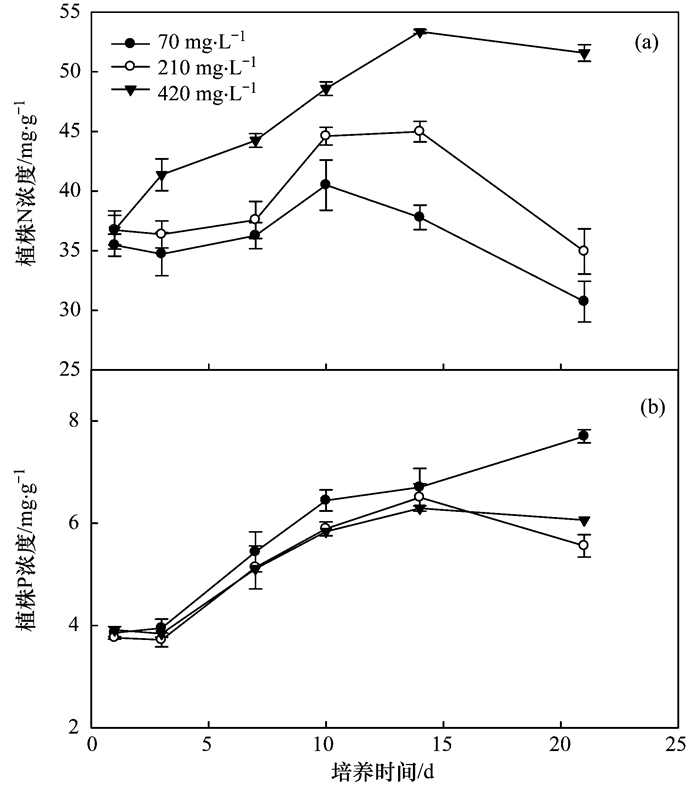 如圖 7(a)所示, 隨著時(shí)間的延長, 植物中N含量亦隨著NH4+-N濃度的提高先增加而后降低, TN的變幅在30.7~53.4 mg·g-1之間. 70 mg·L-1NH4+-N處理下, 綠狐尾藻組織中TN含量的峰值(40.5 mg·g-1)出現(xiàn)在第10 d, 比第1 d增加了14%.當(dāng)NH4+-N水平提高到210 mg·L-1時(shí), 培養(yǎng)7 d之內(nèi), 組織內(nèi)TN含量與對照無顯著差異; 隨著時(shí)間的延長, 組織內(nèi)TN的含量顯著高于對照, 峰值(45.0 mg·g-1)出現(xiàn)在第14 d, 比對照峰值高11.1%.當(dāng)NH4+-N水平達(dá)到420 mg·L-1時(shí), 組織內(nèi)TN的含量顯著高于前兩個(gè)高NH4+-N水平處理, 峰值(53.4 mg·g-1)亦出現(xiàn)在第14 d, 比對照峰值高31.8%.至21 d時(shí), 由于植物生物量的增加導(dǎo)致的稀釋效應(yīng), TN的含量反而有所下降, 甚至低于初始TN含量. 如圖 7(b)所示, 不同高NH4+處理下, 隨培養(yǎng)時(shí)間的延長, 綠狐尾藻組織中TP的含量逐漸增加, TP的變幅在3.8~7.7 mg·g-1之間.短時(shí)間內(nèi)差異不明顯. 70 mg·L-1NH4+-N處理下, 至收獲(21 d)時(shí), 綠狐藻組織中TP達(dá)到最高為7.7 mg·g-1, 比第1 d時(shí)增加了近1倍.當(dāng)NH4+-N水平增加到210 mg·L-1和420 mg·L-1, TP的含量在收獲時(shí)分別比第1 d增加了47.7%和54.9%, 但與70 mg·L-1的處理相比, 分別顯著降低了38.6%和27.0%, 說明高NH4+-N脅迫可能抑制P的吸收.