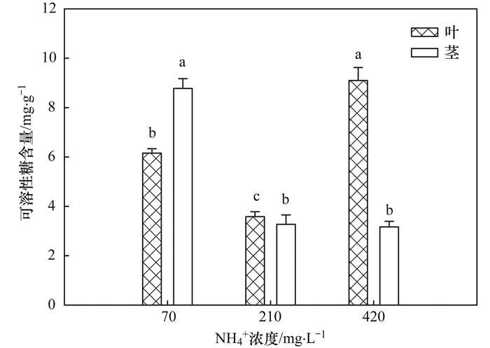 如圖 5所示, 70 mg·L-1的NH4+處理時(shí), 可溶性糖含量在莖顯著比葉中高(P < 0.05), 高42.6%.與70 mg·L-1 NH4+處理相比, 當(dāng)NH4+水平提高到210 mg·L-1時(shí), 葉、莖的可溶性糖含量顯著降低(P < 0.05), 分別降低了41.8%和62.7%;而當(dāng)NH4+水平達(dá)到420 mg·L-1時(shí), 葉中的可溶性糖含量顯著升高(P < 0.05), 增加了47.8%, 而莖中的可溶性糖含量顯著下降, 降低了63.9%.