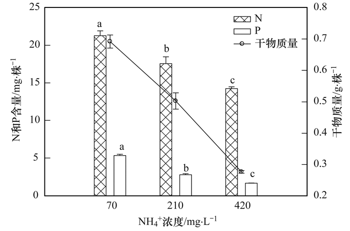 綠狐尾藻對N, P的高效吸收能力是綠狐尾藻濕地系統(tǒng)對污染物凈化能力的重要指標(biāo)之一.魯靜等的研究表明, 洱海流域44種濕地植物的TN和TP含量平均為15.7 mg·g-1和3.3 mg·g-1; 金樹權(quán)等比較研究10種水生植物, 發(fā)現(xiàn)它們N、P含量的變化范圍分別是13.67~26.38 mg·g-1和1.16~3.50 mg·g-1.本研究中, 在不同高濃度NH4+-N處理下, 綠狐尾藻N和P的含量變化范圍為30.7~53.4 mg·g-1和3.8~7.7 mg·g-1, 比已有報(bào)道的水生植物N、P含量均高.已有的研究中N的處理濃度相對比較低, 可能主要因?yàn)槠湓诔^28 mg·L-1的高NH4+-N介質(zhì)中, 會(huì)受到氨毒害而無法正常生長, 從而影響N、P的吸收.綠狐尾藻不僅能在超高NH4+-N的條件下正常生長, 而且可以吸收大量的N和P, 表明其在高NH4+-N的廢水中對N、P去除作將會(huì)有極大的貢獻(xiàn).從圖 8可以看出,當(dāng)NH4+水平高達(dá)210 mg·L-1和420 mg·L-1時(shí),在綠狐尾藻干物質(zhì)的量在直線下降的情況下,其對N、P的累積量雖也顯著下降,但比生物量下降的速度慢.因此, 綠狐尾藻生態(tài)濕地系統(tǒng)高效凈化高NH4+-N的廢水時(shí), 其質(zhì)量濃度的適應(yīng)范圍應(yīng)在420 mg·L-1以下.