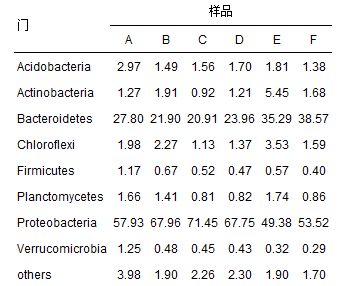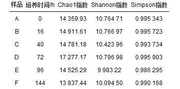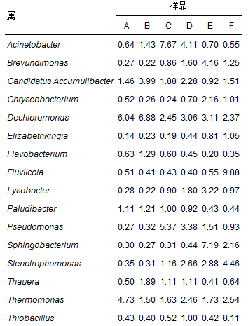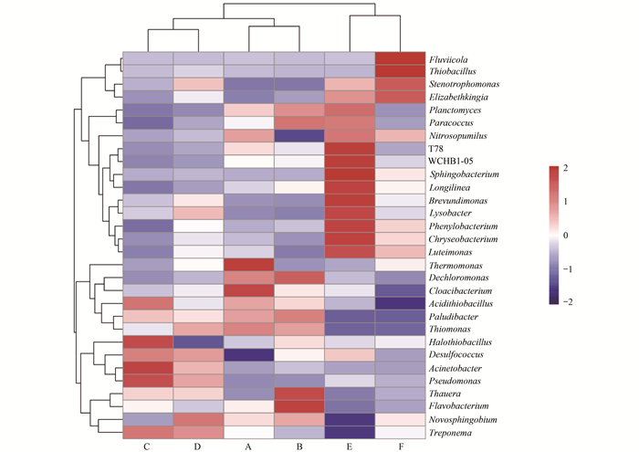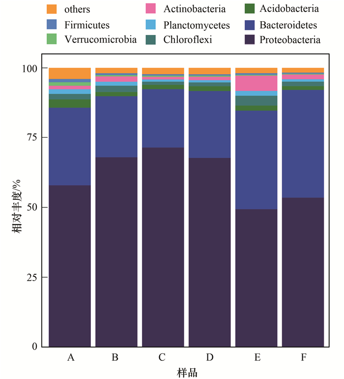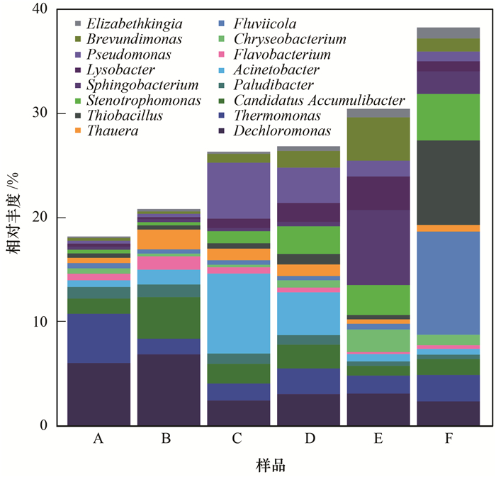 市政污泥在焦化廢水的環境中馴化, 其微生物菌落結構會發生相應的變化從而適應新的廢水環境.通過Illumina高通量測序對污泥中微生物菌落進行初步分析.其中A、B、C、D、E、F分別表示培養時間為0、16、40、72、96、144 h的活性污泥樣品.