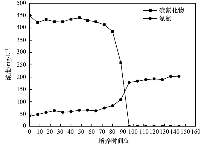 該反應器中焦化廢水主要污染物質的起始濃度為COD 3 432.20 mg·L-1、苯酚469.04 mg·L-1、硫氰化物450.00 mg·L-1、氨氮41.10 mg·L-1, 經過144 h的反應后各物質的濃度變為COD 376.06 mg·L-1、苯酚0.36 mg·L-1、氨氮203.66 mg·L-1, 硫氰化物在反應96 h時其濃度已低于檢測下限(0.1 mg·L-1).這次反應中, COD的去除率為89.04%, 其中苯酚、硫氰化物的去除率更是高達99.92%、100%.由此可見, 市政污泥能在較短的時間內適應焦化廢水的劇毒環境, 并迅速降解廢水中苯酚、硫氰化物等污染物質.