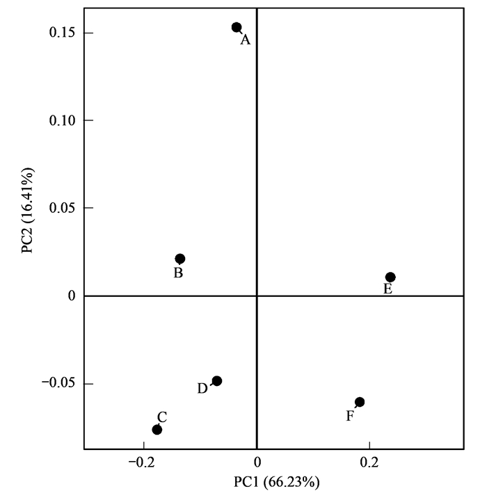 從表 1中樣品的序列組成及OTU組成可知, 市政污泥投入焦化廢水中后, 運行16 h的污泥樣品序列和OTU組成從31 985、8 070下降至28 304、7 225, 說明焦化廢水對市政污泥的微生物群落表現出一定的毒性, 培養起始階段部分微生物死亡, DNA溶解.從表 2的Shannon指數和Simpson指數可知, 0 h和16 h的數值相差很小, 說明微生物群落多樣性幾乎沒有變化. 40 h的Shannon指數和Simpson指數有所下降, 即此時微生物多樣性比0 h和16 h略低. 72 h的OTU數、Shannon指數和Simpson指數又有所提升, 表明污泥在適應焦化廢水后, 微生物利用焦化廢水的污染物為營養物質生長, 造成序列數、OTU數比40 h時提高了, 同時Shannon指數和Simpson指數也同樣升高, 多樣性回復到0 h及16 h的水平.隨后的96 h, 污泥雖然適應了焦化廢水的環境, 焦化廢水中的大部分碳源已被利用, 微生物處在缺營養狀態, 氨氮的濃度快速上升, C/N比嚴重失衡, 高的氨氮濃度也會抑制微生物的生長, 部分微生物因不適應此環境而死亡, 故此時的序列數、OTU數開始下降, 微生物多樣性指數有較明顯的降低.如圖 4所示, 樣品的PCoA分析圖中兩個物種在坐標軸之間的距離越近, 表示兩個樣品的物種組成越相似, 從中可知:A和B組成相似, C和D組成相似, E和F組成相似, 這3組間的組成差異大, 與該3個時間段相對應的廢水污染物的組成成分也存在較大的差異, 表明微生物群落的結構變化是隨著廢水成分的改變及污染物成分的降解而相應改變.