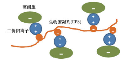在絮凝機理上,絕大部分文獻中只考慮了靜電作用力,把生物絮凝歸結于吸附架橋作用,具體又可細分為以下兩種機制:①長鏈EPS在不同部位吸附多個帶負電的藻細胞形成架橋作用(Bridging); ②短鏈EPS在局部逆轉藻細胞的電負性,從而形成所謂的靜電互補效應(Patching)(圖 3).這一理論的基礎是將生物絮凝劑(EPS)默認為陽離子型高聚物. 但如2.2.1節所述,EPS在中性及堿性條件下本身是帶負電的. 那么,生物絮凝劑是如何實現陽離子化的呢?一個相對成熟的理論為二價陽離子架橋理論(Divalent Cation Bridging(DCB)Theory),可結合圖 4說明如下: EPS本身具有多個帶負電的活性部位,這使其能強烈吸附環境中的二價陽離子. 被吸附的二價陽離子所帶正電荷只被EPS中和了一半,所以能另外吸附一個帶負電的藻細胞. 由此,多個藻細胞通過二價陽離子的架橋作用連接在EPS上,形成大的絮體. 這一理論能很好地解釋為什么多價陽離子對生物絮凝具有顯著的強化作用甚至是絮凝形成的必要條件. 這一理論也能解釋絮凝效果隨pH升高而增強的現象: pH升高,EPS電負性增強,吸附二價陽離子的能力增強,所以架橋作用增強. 但如上所述,在部分研究中陽離子的存在對絮凝效果根本就沒有影響(Wan et al., 2013). 這就無法用DCB理論解釋了. DCB理論最根本的缺陷在于,理論上應該是所有帶負電的EPS都能通過二價陽離子的架橋作用形成絮凝. 但這顯然是與事實不符的. 這一問題將在4.3節部分得到進一步討論.