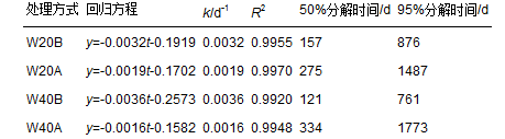 由表 2可知,在不同處理下根系分解殘留率經(jīng)過(guò)指數(shù)模型分析其R2>0.99(p<0.05),符合Olson單指數(shù)分解模型,W20B、W20A、W40B、W40A處理的分解常數(shù)(k)分別為 0.0032、0.0019、0.0036、0.0016 d-1.