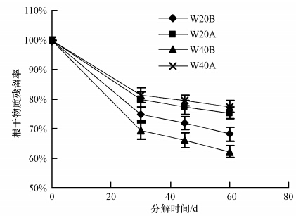 由圖 1 可知,根干物質(zhì)的殘留率都隨著時(shí)間的延長(zhǎng)而下降,添加在污水中的Cr6+會(huì)抑制根的分解,根的殘留率比不添加鉻處理的大.埋根后30~60 d,不同處理下薏米根干物質(zhì)殘留率差異顯著(p<0.05); A桶的根干物質(zhì)殘留率顯著大于B桶,其差異隨著Cr6+濃度的增大而增大.不同處理之間,根的干物質(zhì)殘留率大小順序?yàn)椋篧40A>W20A>W20B>W40B.在0~30 d,不同處理下的根分解迅速,此為快速損失階段,也是易溶性物質(zhì)的淋溶階段.在30~60 d,根分解變慢,殘留率變化不大,之后根分解緩慢為慢速損失階段.