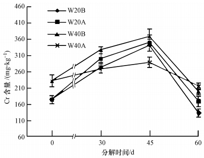 根中的鉻元素變化動(dòng)態(tài)可以用根殘留體中鉻元素含量變化和鉻元素絕對(duì)量的變化來(lái)描述.鉻元素絕對(duì)量的變化用鉻元素殘留率表示,是由根殘留體中鉻元素質(zhì)量除以初始根中鉻元素的質(zhì)量而得.由圖 2可知,在0~60 d的分解過(guò)程中根殘留體Cr含量呈先升高后下降的趨勢(shì).埋根30 d時(shí),不同處理的根內(nèi)Cr含量均提高,且與初始含量差異顯著(p<0.05),W20B、W40A兩者之間差異不顯著,但均與W20A、W40B差異顯著(p<0.05).45 d時(shí),W20B、W20A、W40B、W40A處理根內(nèi)Cr含量分別比根初始含量增大了94.72%、98.92%、58.84%、24.36%.不同處理下都是在分解45 d后Cr含量開(kāi)始下降,W20B處理下降的幅度最大,下降了60.69%.在分解60 d后,W20B、W20A、W40B、W40A處理根的Cr含量差異顯著(p<0.05),分別為134.82、170.12、199.78、216.56 mg · kg-1,根殘留體的Cr含量均小于初始含量.