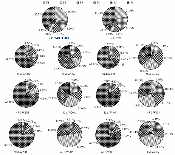 在60 d的分解過(guò)程中,人工濕地植物薏米根系的分解速率呈現(xiàn)前30 d快速分解,后30 d慢速分解的模式.根內(nèi)Cr含量變化在埋根30~45 d呈增加的趨勢(shì),在45 d之后又呈下降的趨勢(shì),不同的處理?xiàng)l件下,根內(nèi)Cr可分為固持和釋放兩個(gè)階段.根系分解過(guò)程中,不同處理的F1、F2形態(tài)Cr含量均大幅度下降.分解60 d后,W20B、W40B處理的F6百分比分別為76.76%、68.67%,故以F6為主要優(yōu)勢(shì)的形態(tài)分布;但W20A、W40A處理的 F6比例均顯著降低,最終以F4比例最高,其他形態(tài)次之.