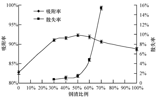 將鋼渣(100目)和蒙脫石按1 : 1質量比混合,其中,添加10%的工業淀粉和水進行攪拌,制成顆粒(Φ2 mm×4 mm)并在400 ℃下焙燒1 h,制得鋼渣-蒙脫石復合吸附劑.