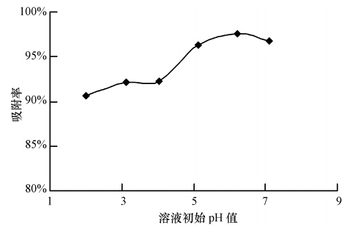 準確稱取1.2 g鋼渣-蒙脫石復合吸附劑并置于250 mL的錐形瓶中,分別加入100 mL濃度為100 mg · L-1的Cd2+溶液,用0.5 mol · L-1 HCl溶液和0.5 mol · L-1 NaOH溶液調節初始pH值,分別調節至2.0、3.0、4.0、5.0、6.0、7.0,在溫度25 ℃下吸附2 h,考察鋼渣-蒙脫石復合吸附劑對Cd2+溶液的吸附去除率.鋼渣-蒙脫石復合吸附劑中的堿性氧化物在水中會發生水解,使溶液pH值上升.由圖 3可知,當溶液初始pH值為2~4時,吸附后的溶液pH值為3.4~5.5,此時鋼渣-蒙脫石復合吸附劑對溶液中Cd2+的吸附效果變化不明顯,由約91%上升至92%.這是由于 H+過多地占據了復合吸附劑表面Cd2+的吸附位,表面負電荷減少,降低了顆粒吸附劑與鎘的結合力.當初始溶液pH值為4~5時,吸附后的溶液pH值為5.5~6.8,H+的競爭作用減弱,更多的結合位點釋放出來,吸附率由92.3%上升至96%.當初始pH值為5~7時,吸附后的溶液pH值為6.8~8.3,此時復合吸附劑表面Cd2+的吸附位被逐漸占據,并且pH值為6左右時,Cd2+即可與溶液中的OH-等形成沉淀,使溶液中可移動的Cd2+濃度下降.當初始pH值為6.22,即吸附后pH值為7.6時吸附率達到最高值97.6%,因此,將pH確定為偏中性6~7之間.