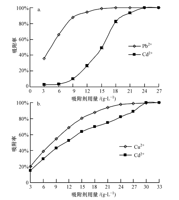 在鉛鎘混合溶液中,復合吸附劑對重金屬離子的吸附情況如圖 7a所示.由圖 7a可以看出,Pb2+和Cd2+的吸附效果差異性較大,相對于Cd2+,Pb2+更優先被鋼渣-蒙脫石顆粒吸附材料所吸附.當吸附劑用量為3~6 g · L-1時,Cd2+的吸附率幾乎不變而Pb2+的吸附率則由約35%上升至67%左右;吸附劑用量為6~9 g · L-1時,Cd2+吸附率逐漸由3%上升至10%;而在吸附劑用量為9~24 g · L-1時,由于Pb2+逐漸接近吸附平衡,對Cd2+的競爭作用減小,從而使Cd2+的吸附率急速上升,由10%上升至95%以上;在吸附劑用量為24 g · L-1后,Pb2+與Cd2+均達到吸附平衡.因此,在Pb2+的影響下,鋼渣-蒙脫石復合吸附劑對Cd2+的吸附量平均為4.17 mg · g-1.