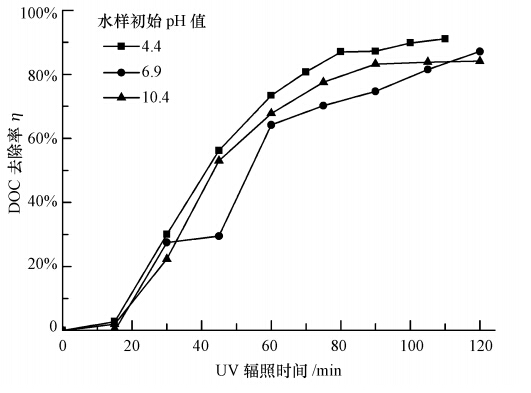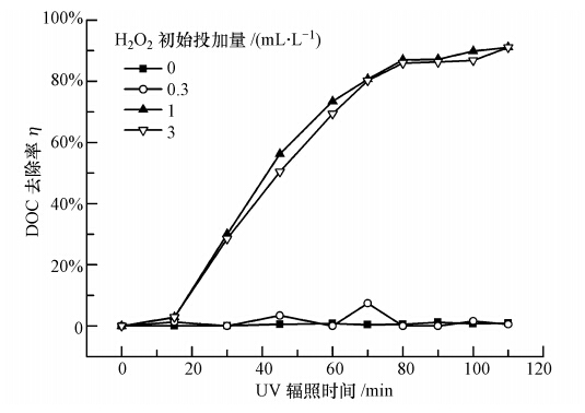 礦化率即DOC去除率(η)計算公式為:η=(C0-Ct)/C0×100%,其中,C0、Ct分別為初始及反應t時刻的水樣DOC濃度(mg · L-1).