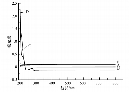 去污劑共5種,取自某電廠實用去污劑,編號為A~E,各去污劑原液的DOC濃度見表 1.實驗采用自配水,用自來水配制成DOC濃度為15~100 mg · L-1的模擬廢水用于試驗,其中,自來水的DOC濃度為0.1 mg · L-1,可忽略.因所用模擬廢水的DOC濃度大多在50 mg · L-1附近,故將該濃度下各去污劑水溶液pH值列入表 1.對5種去污劑進行了紫外可見(UV-Vis)光譜掃描和紅外光譜分析,在進行UV-Vis掃描時,因去污劑的吸光度超過儀器量程,故用純水稀釋1000倍后測定.H2O2(30%)為分析純.溶液pH值采用1 mol · L-1氫氧化鈉溶液或稀硫酸進行調節.