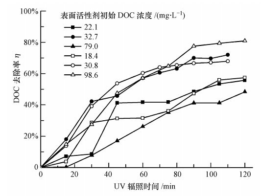 此外,由圖 1可以清楚地看到,反應時間對礦化效果的影響非常明顯,當反應時間在30 min以內時,對DOC的去除率在5%~40%的范圍.Pagano等(2008)的研究也發現,反應時間為30 min時,即使表面活性劑的去除率已經接近100%,但對COD和DOC的去除率均較低(分別為0~25%和0~18%).該結果與本研究的結果保持一致,進一步說明UV輻照時間是影響礦化率的關鍵因素.胡俊生等(2007)利用UV/H2O2氧化處理100 mg · L-1的十二烷基苯磺酸鈉(SDBS),發現最佳反應時間為1 h,而本研究中最佳反應時間為1.5 h.這些差異可能與表面活性劑的種類及初始濃度有關,同時值得注意的是本文測試是礦化率(即DOC去除率),而前者測定是表面活性劑的去除率.