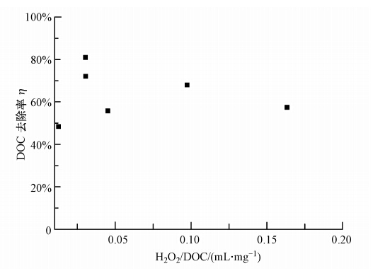 對比去污劑初始DOC濃度相似時,H2O2投加量對去污劑DOC去除的影響.當去污劑初始DOC濃度在10~30 mg · L-1時,H2O2投加量為1 mL · L-1和3 mL · L-1的兩組試驗結果無顯著差異;當去污劑初始濃度在80~90 mg · L-1時,高投量H2O2能顯著促進對DOC的去除.DOC去除率隨H2O2/DOC比值的變化規律見圖 4,可知當H2O2/DOC比值為0.03 mL · mg-1,即每30 mg DOC投加1 mL H2O2時,對應的DOC去除率最高,可達70%~80%.也就是說,H2O2投加量存在最適范圍,當投加量過大或過小時,對氧化過程是負影響.由圖 4也說明,采用H2O2/DOC比值表示投加量是比較合適的參數.