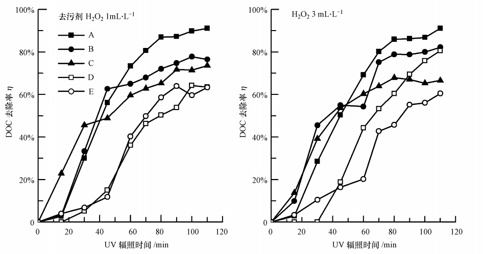由圖 2可知,去污劑C和D在270 nm處有微弱吸收,當其濃度較高時,可能在254 nm處也有一定吸收,影響紫外光的透光率及反應速率.故選取去污劑C為例,考察其初始濃度對氧化效果的影響,結果見圖 3.投加1 mL · L-1的H2O2時(圖中實心符號),對初始DOC濃度為32.7 mg · L-1水樣的礦化效果最好,DOC去除率最大可達70%,而初始DOC濃度最大的79 mg · L-1水樣對應的DOC去除率最低,最大僅達到50%.在H2O2投加量為3 mL · L-1時(圖中空心符號),對較高初始濃度(30.8和98.6 mg · L-1)水樣的DOC去除率在輻照前80 min無顯著差異,之后對高濃度水樣的DOC去除率更高,最大去除率分別為70%和80%,而對低濃度(18.4 mg · L-1)水樣的DOC去除率相對較低,最大去除率為60%.由此可見,去污劑初始濃度對于氧化效果有一定影響,在H2O2投加量一定時,去污劑初始濃度超過一定范圍時,處理效果變差,即一定條件下,去污劑初始濃度對氧化效果有負影響.
