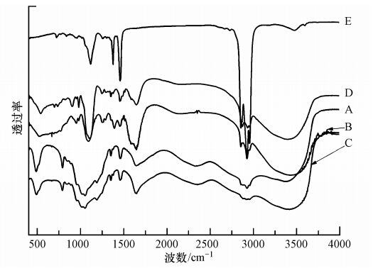 對5種去污劑進行了紅外光譜的定性分析,結果見圖 7.由圖可知,5種去污劑的紅外光譜圖各不相同,但有些去污劑的主要吸收峰有類似的特征.例如,去污劑A~D均在1645 cm-1和1458 cm-1處有較強吸收,此位置可能是COO-的特征吸收,而去污劑E的紅外光譜中無此吸收峰;去污劑B和C分別在3420 cm-1和1060 cm-1處有較強吸收;去污劑D和E在1100 cm-1處有較強吸收.但因去污劑成分復雜,僅從紅外譜圖很難推測去其成分.但結合圖 5,可以推斷去污劑的成分和主要官能團的差異將導致UV/H2O2氧化效果的不同.