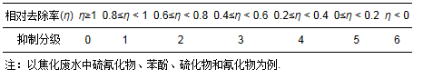 式中,η2為實驗組18 d時的COD去除率.根據式(1) 得出相對去除率η,各實驗組的毒性抑制分級按照表 3分級標準判定,其中,無抑制定義為0級,殺菌性抑制定義為6級,抑制等級越高,抑制程度越大.將焦化廢水原水的復合抑制性濃度和硫氰化物、苯酚、硫化物和氰化物等毒性物質各自的抑制效應分級列于表 4中.