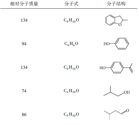 紫外吸收光譜的結(jié)果表明,在降解過(guò)程中,有機(jī)污染物的特征吸收峰逐漸消失,且沒(méi)有產(chǎn)生新的吸收峰,近紫外區(qū)的吸光度逐漸趨于零.說(shuō)明溶液中的有機(jī)污染物逐漸被降解為小分子飽和烷烴、CO2和H2O.為了進(jìn)一步研究有機(jī)物的降解歷程,利用GC-MS對(duì)BPA和PNP進(jìn)行中間產(chǎn)物的分析,結(jié)果見表 1和表 2.
