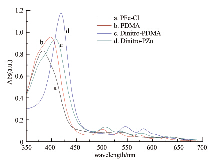 硝基取代鋅卟啉(Dinitro-PZn)合成:將Dinitro-PDMA溶于適量DMF中,加熱回流,分批加入與卟啉等物質(zhì)的量的醋酸鋅,回流反應(yīng)4 h后停止,將反應(yīng)液冷卻至室溫后,于低溫下靜置過(guò)夜;過(guò)濾沉淀,濾餅分別用稀醋酸、水和乙醇洗滌,收集固體干燥即得產(chǎn)物.