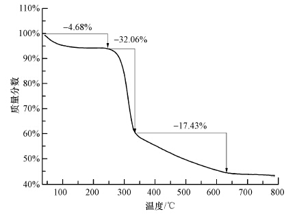 圖 3是催化劑的熱失重曲線,在40~800 ℃的范圍內(nèi),該曲線呈現(xiàn)出3個(gè)明顯的失重區(qū),其中,100 ℃以內(nèi)減少的4.68%是催化劑吸附的水分子質(zhì)量,第2個(gè)失重區(qū)損失的是卟啉的質(zhì)量,失重溫度在300 ℃左右,失重率為32.06%,即催化劑負(fù)載率為32.06%.在340~700 ℃范圍內(nèi)緩慢減少的質(zhì)量為復(fù)合載體中的纖維素,失重率為17.43%.剩余的質(zhì)量為載體中的四氧化三鐵,質(zhì)量含量為45.83%.另外,從熱失重曲線也可以看出,在300 ℃以下,催化劑可以穩(wěn)定存在,具有較好的熱穩(wěn)定性.