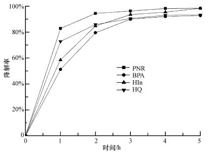 分別以BPA、HIn、HQ及PNP為待降解物,考察催化劑的催化活性.結(jié)果表明,降解反應(yīng)主要集中在前2 h內(nèi),雖然催化劑對(duì)以上4種物質(zhì)的降解速率不同,但降解3 h后降解率皆能達(dá)到80%以上,5 h后最高能達(dá)到98%左右(圖 5).