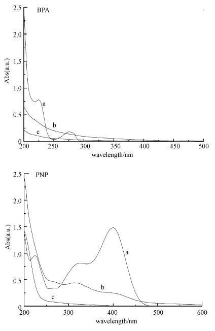 圖 9為降解產(chǎn)物的實(shí)驗(yàn)跟蹤結(jié)果,以BPA和PNP為例,記錄降解過(guò)程中溶液的紫外吸收光譜.其中,曲線a、b、c分別代表降解前、降解1 h及降解5 h后的溶液.