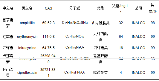 抗生素溶液的配置:目標抗生素濃度依據《臨床和實驗室標準協會》(Clinical And Laboratory Standards Institute, CLSI)中抗生素對細菌的最小抑制濃度確定, 具體如表 2所示.首先配制高濃度的抗生素作為母液, 其中氨芐霉素(10 g·L-1)、四環素(1 g·L-1)、卡那霉素(10 g·L-1)和環丙沙星(1 g·L-1)溶液的溶劑均為超純水, 并采用0.45 μm水相濾頭過濾; 而紅霉素(10 g·L-1)的溶劑為甲醇, 并采用0.45 μm有機相濾頭過濾.過濾之后的抗生素溶液需保存于-20℃冰箱中, 且保存時間不宜超過一周.在使用時根據所需要抗生素的濃度取相應體積母液進行稀釋.