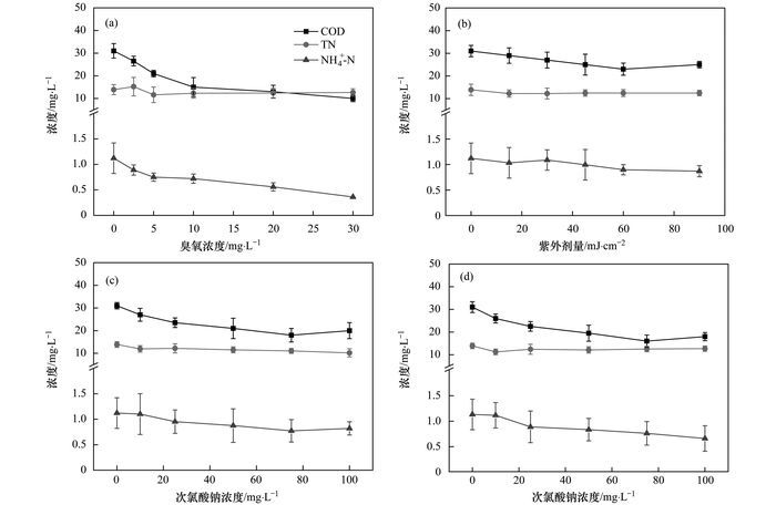 (a)為COD、TN和NH4+-N濃度隨臭氧濃度變化的情況; (b)為COD、TN和NH4+-N濃度隨紫外劑量變化的情況; (c)為COD、TN和NH4+-N濃度隨次氯酸鈉濃度變化的情況; (d)為在紫外劑量為30.0 mJ·cm-2的條件下, COD、TN和NH4+-N濃度隨次氯酸鈉濃度變化的情況