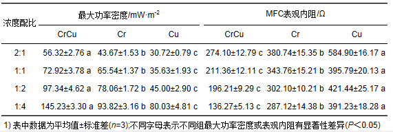 表 1 Cr(Ⅵ)/Cu(Ⅱ)濃度配比對MFC最大功率密度及表觀內阻的影響