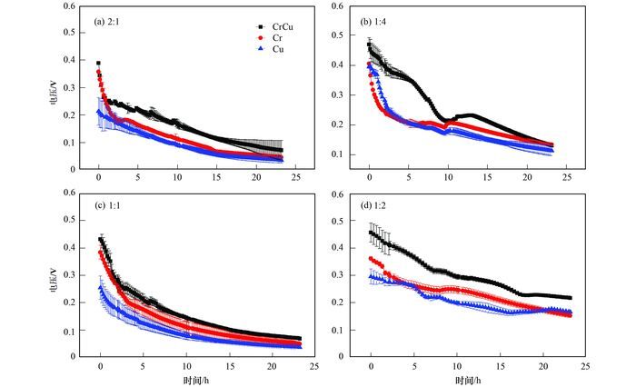 圖 1為Cr(Ⅵ)/Cu(Ⅱ) 4個濃度配比下MFC的輸出電壓情況.從中可知, 隨著復配Cu(Ⅱ)濃度比例的增加, 各組MFC的輸出電壓水平也隨著提高, 濃度配比為1:4條件下, 各組MFC獲得的最大輸出電壓分別為(468.3±23.4) mV(CrCu組)、(404.34±8.73) mV(Cr組)、(394.44±5.8) mV(Cu組), 均高于其他條件下對應的各組MFC的輸出電壓.從圖中還可以看出, 不同濃度配比條件下, CrCu組輸出電壓均大于Cr組和Cu組, 在濃度配比為1:4時, CrCu組最大輸出電壓為Cr組的1.16倍, 是Cu組的1.19倍.