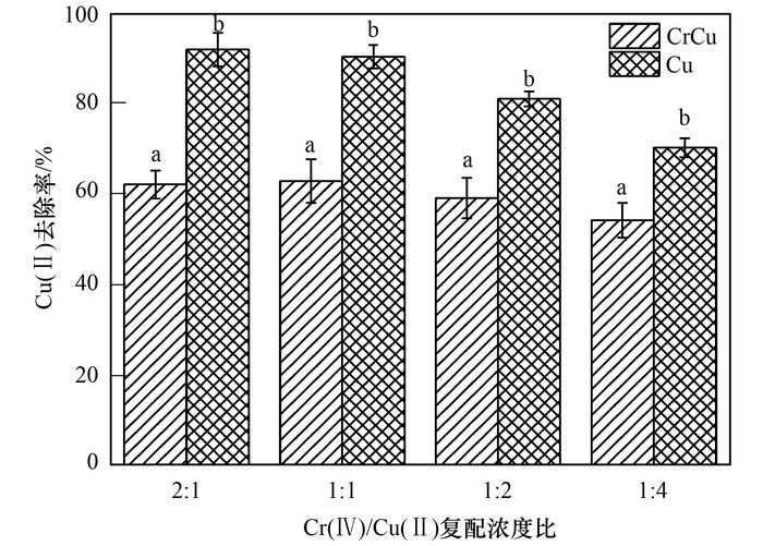 不同字母表示不同組Cu(Ⅱ)去除率有顯著性差異(P<0.05)