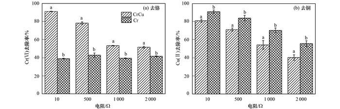(2) 選取Cr(Ⅵ)/Cu(Ⅱ)濃度配比為1:4, 在所設置外電阻(10、500、1 000、2 000 Ω)條件下, Cu(Ⅱ)對MFC陰極去鉻的強化作用隨著外電阻的降低而顯著.在外電阻為10 Ω時, CrCu組MFC陰極Cr(Ⅵ)去除率達91.00%, 較Cr組提高了132.57%.