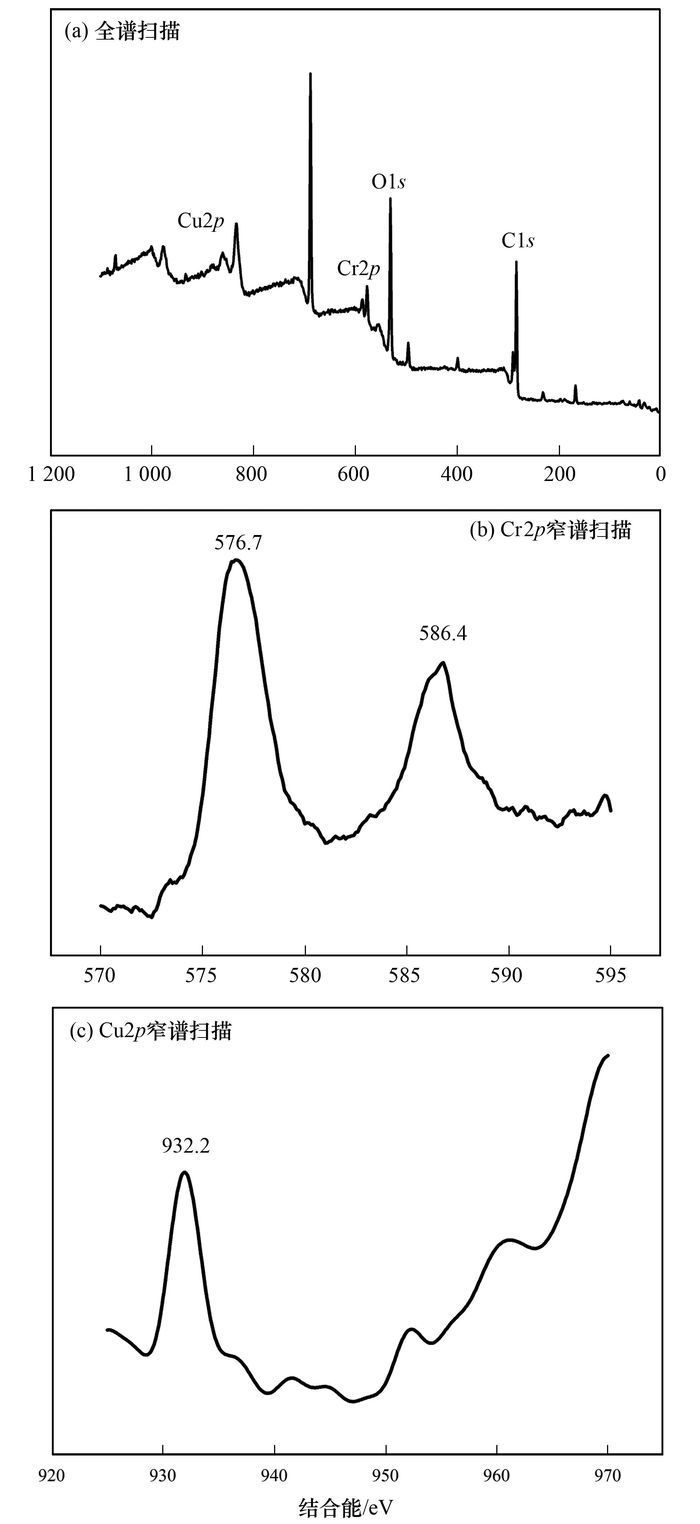 最后, 本文利用XPS對CrCu組電極附著物進行了進一步分析. 圖 6(a)為CrCu組電極表面附著物的XPS全掃描圖譜, 表明附著物主要含有C、O、Cr、Cu這4種元素. 圖 6(b)及6(c)分別為Cr2p和Cu2p的窄譜掃描圖.如圖 6(b)所示, 在結合能為576.7 eV和586.4 eV處分別出現了Cr2p1/2和Cr2p3/2的特征峰, 對照XPS譜圖庫可知該物質為Cr2O3, 因此確認了Cr(Ⅵ)在MFC陰極的還原產物為Cr2O3.而如圖 6(c)所示, 在結合能為932.2 eV處出現Cu2p3/2的特征峰, 對照XPS譜圖庫可知該物質為Cu或Cu2O, 結合EDS結果可以確定Cu(Ⅱ)在MFC陰極的還原產物為Cu單質和Cu2O. Cu單質是一種公認的優良導體, 而Cu2O也是性質優良的半導體材料, 被廣泛應用于催化制氫、超導、太陽能電池、光催化材料、光電轉化開關、光信息存儲介質及傳感器等領域.因此Cu(Ⅱ)還原產物在陰極電極的附著可在一定程度上提高電極的導電性能, 減緩Cr2O3引起的陰極鈍化.