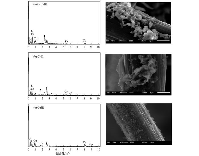 實驗結束后, 將各組MFC陰極電極取出進行SEM-EDS分析.如圖 5所示, 各電極表面均有明顯的固體物質附著, CrCu組[圖 5(a)]附著物明顯比其他兩組較多且較厚, CrCu組和Cr組[圖 5(b)]附著物均呈團聚塊狀不均勻分布, 而Cu組[圖 5(c)]附著物則均勻分布于電極表面.通過EDS對電極表面附著物進行元素分析可知, CrCu組電極表面附著物中檢測到了Cr、Cu、O元素; Cr組附著物中檢測到了Cr、O元素; Cu組附著物中檢測到了Cu、O元素.根據所檢測到的元素原子比例推測Cr組附著物含Cr2O3, Li等通過對電極上的附著物進行分析確定了電極上的附著物質為Cr2O3. Cu組附著物根據元素原子比例推測其可能為Cu單質和Cu2O的混合物, 印霞棐等和Zhang等通過XRD分析確定了MFC陰極Cu(Ⅱ)還原產物為Cu單質和Cu2O.由此可以初步確定MFC陰極電極附著物中含Cr物質為Cr2O3, 含Cu物質為Cu和Cu2O.